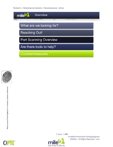 Module 3 – Detecting Live Systems – Reconnaissance - Active Report piracy if the fingerprint in this box is of poor resolution! P a g e | 132 Certified Penetration Testing Engineer ©Mile2 – All Rights Reserved – v4.1