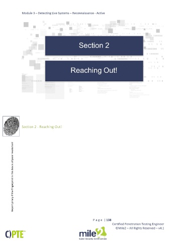 Module 3 – Detecting Live Systems – Reconnaissance - Active Section 2 - Reaching Out! Report piracy if the fingerprint in this box is of poor resolution! P a g e | 138 Certified Penetration Testing Engineer ©Mile2 – All Rights Reserved – v4.1