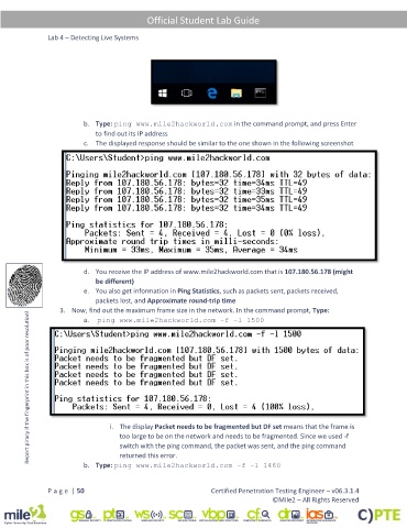 b. Type: ping www.mile2hackworld.com -f -l 1460
