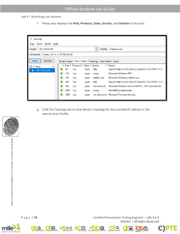 f. Nmap also displays the Port, Protocol, State, Service, and Version of the scan.